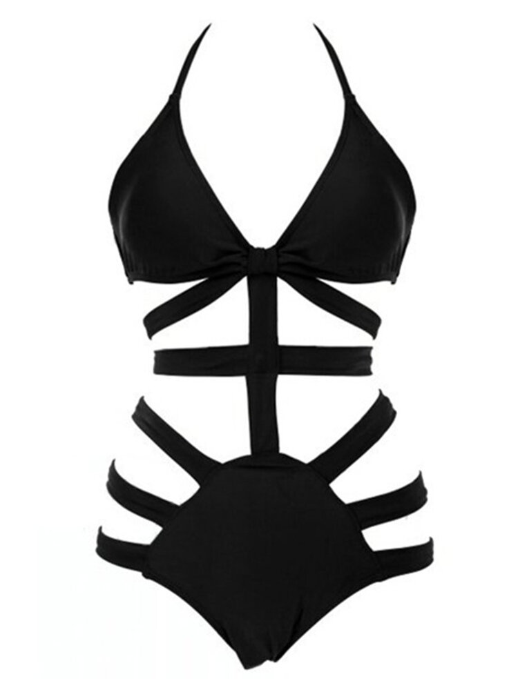 Sexy Halterneck Black Blue Cut Out Bandage One-Piece Monokini Swimming Wear